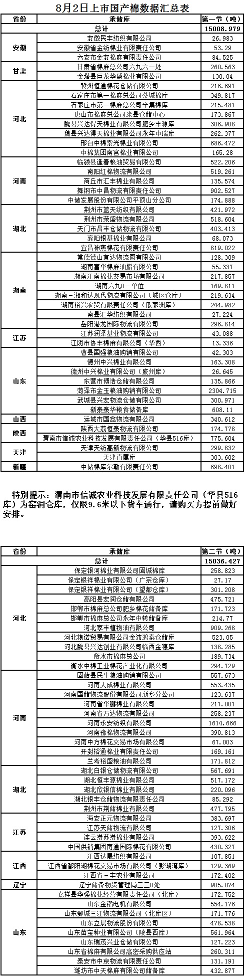 8月2日兩節(jié)共計(jì)輪出儲備棉30045.406噸。第一節(jié)銷售儲備棉15008.9790噸,其中國產(chǎn)棉15008.9790噸、進(jìn)口棉0噸。第二節(jié)銷售儲備棉15036.4270噸,其中國產(chǎn)棉15036.4270噸、進(jìn)口棉0噸。