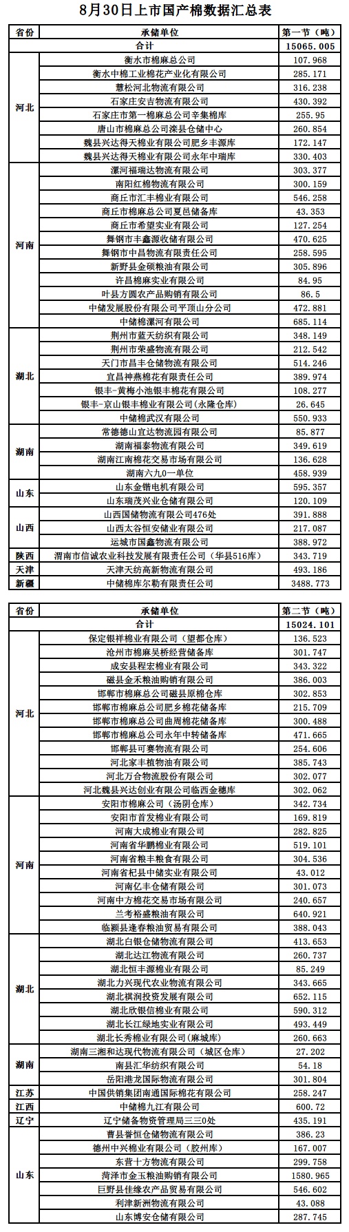 8月30日兩節(jié)共計(jì)輪出儲(chǔ)備棉30089.106噸。8月30日第一節(jié)銷售儲(chǔ)備棉15065.005噸,其中國產(chǎn)棉15065.005噸、進(jìn)口棉0噸。8月30日第二節(jié)銷售儲(chǔ)備棉15024.101噸,其中國產(chǎn)棉15024.101噸、進(jìn)口棉0噸。