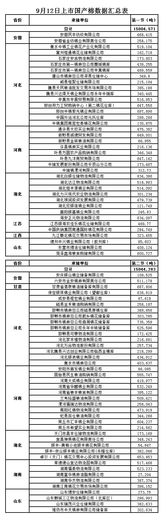 9月12日兩節(jié)共計(jì)輪出儲(chǔ)備棉30048.854噸。第一節(jié)銷售儲(chǔ)備棉15004.5710噸,其中國產(chǎn)棉15004.5710噸、進(jìn)口棉0噸。第二節(jié)銷售儲(chǔ)備棉15044.2830噸,其中國產(chǎn)棉15044.2830噸、進(jìn)口棉0噸。