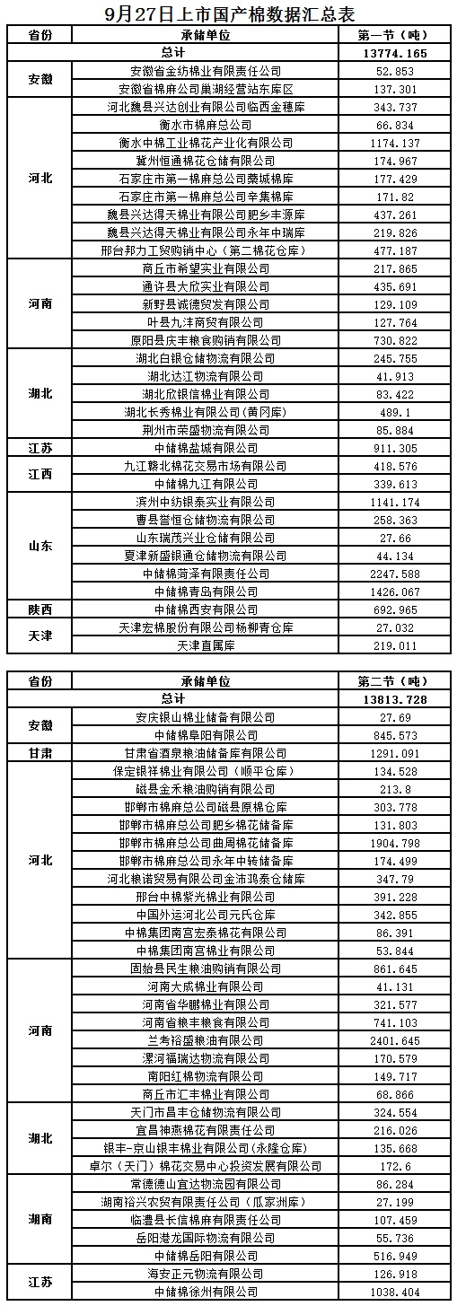 9月27日兩節(jié)共計(jì)輪出儲(chǔ)備棉27587.893噸。第一節(jié)銷售儲(chǔ)備棉13774.1650噸,其中國產(chǎn)棉13774.1650噸、進(jìn)口棉0噸。第二節(jié)銷售儲(chǔ)備棉13813.7280噸,其中國產(chǎn)棉13813.7280噸、進(jìn)口棉0噸。