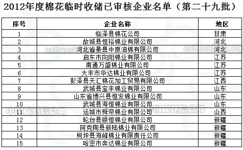 2012年度棉花臨時(shí)收儲(chǔ)已審核企業(yè)名單(第二十九批)