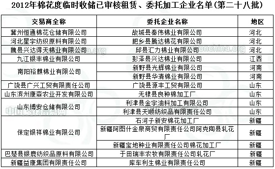 2012年度棉花臨時(shí)收儲(chǔ)已審核租賃、委托加工企業(yè)名單(第二十八批)