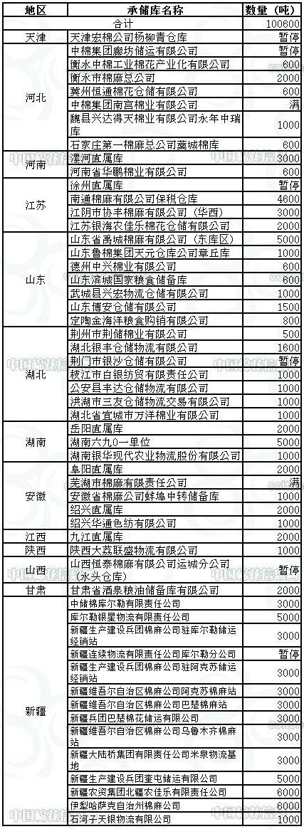 錦橋紡織網(wǎng)—資訊頻道> 棉花信息> 收儲>正文 10月15日收儲預(yù)告:計(jì)劃收儲100600噸