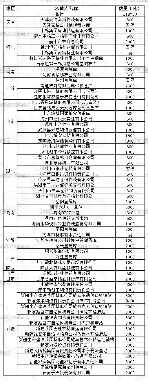 定于10月16日在以下指定倉庫收儲2012年度棉花118700噸。