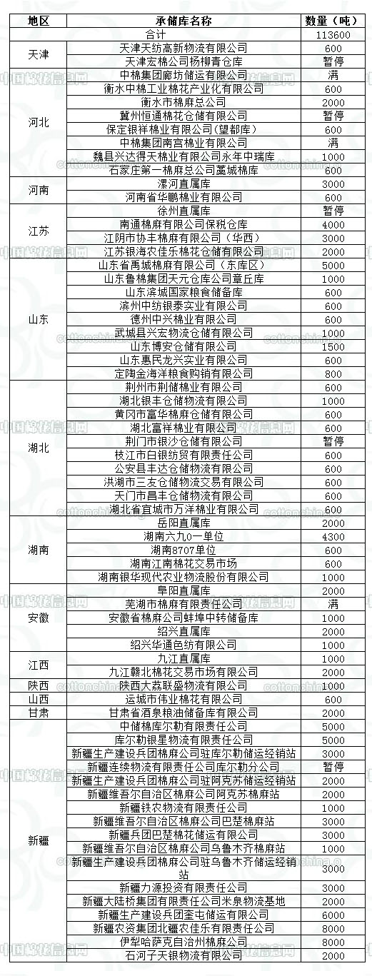 定于10月18日在以下指定倉庫收儲2012年度棉花113600噸。
