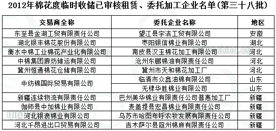 2012年度棉花臨時(shí)收儲(chǔ)已審核企業(yè)名單(第三十八批)