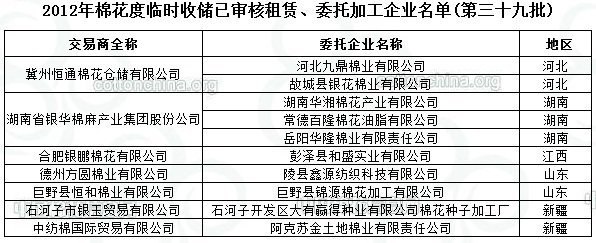 2012年度棉花臨時(shí)收儲(chǔ)已審核租賃、委托加工企業(yè)名單(第三十九批)