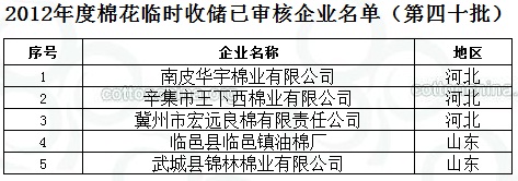 2012年度棉花臨時(shí)收儲(chǔ)已審核企業(yè)名單(第四十批)