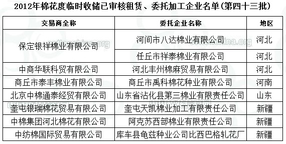 2012年棉花度臨時收儲已審核租賃、委托加工企業(yè)名單(第四十三批)