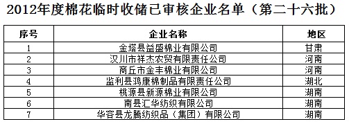 2012年度棉花臨時(shí)收儲已審核企業(yè)名單(第二十六批)