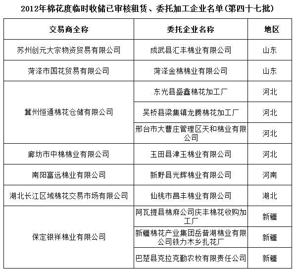 2012年度棉花臨時收儲已審核租賃、委托加工企業(yè)名單(第四十七批)