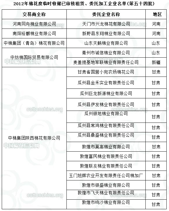 2012年度棉花臨時(shí)收儲(chǔ)已審核租賃、委托加工企業(yè)名單(第五十四批)
