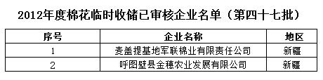 2012年度棉花臨時收儲已審核企業(yè)名單(第四十七批)