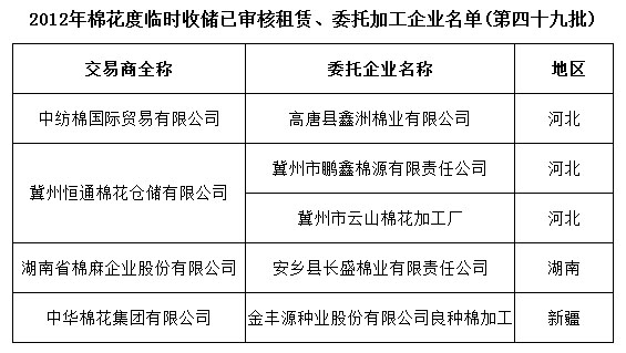 2012年度棉花臨時收儲已審核租賃、委托加工企業(yè)名單(第四十九批)