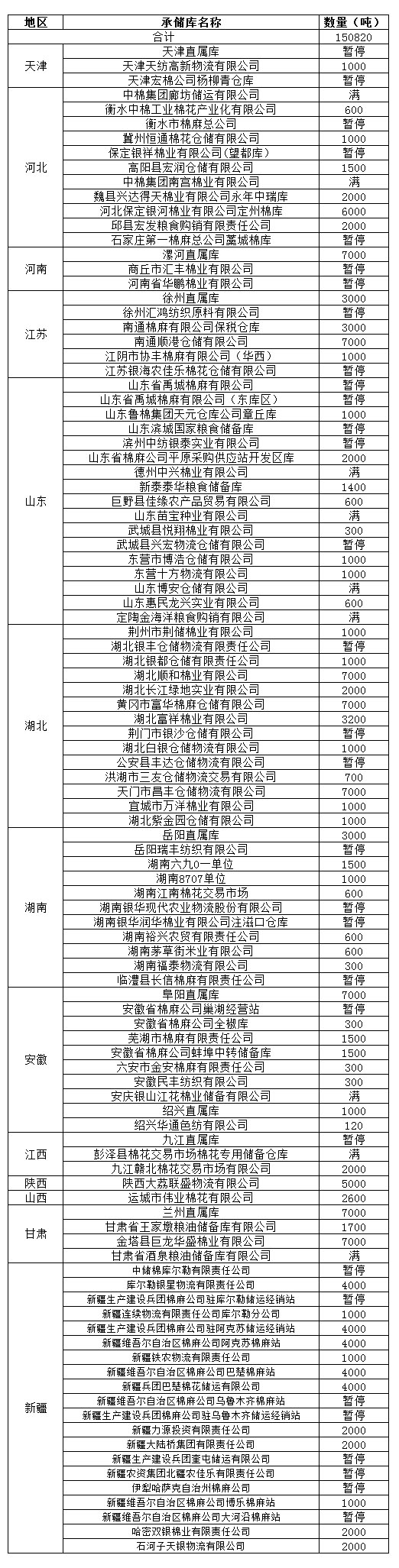 定于11月21日在以下指定倉庫收儲2012年度棉花150820噸。