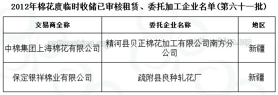 2012年度棉花臨時收儲已審核租賃、委托加工企業(yè)名單(第六十一批)