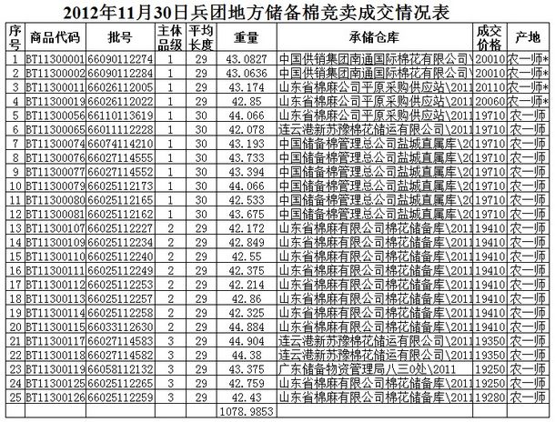 錦橋紡織網(wǎng)—資訊頻道> 棉花信息> 收儲>正文 11月30日兵團棉花競賣成交結(jié)果