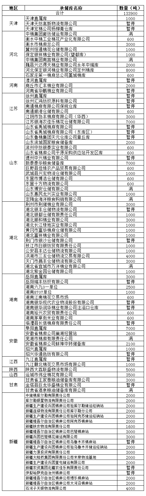 定于11月7日在以下指定倉(cāng)庫(kù)收儲(chǔ)2012年度棉花133900噸。