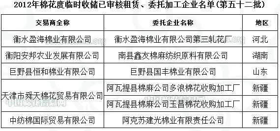 2012年度棉花臨時收儲已審核租賃、委托加工企業(yè)名單(第五十二批)