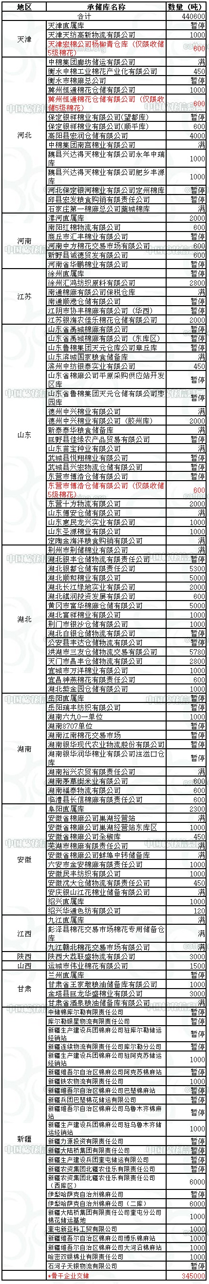 定于12月21日在以下指定倉(cāng)庫(kù)收儲(chǔ)2012年度棉花440600噸(含骨干企業(yè)交儲(chǔ)棉花345000噸)。哈密雙銀棉業(yè)有限責(zé)任公司僅限東疆棉花企業(yè)競(jìng)拍,新疆維吾爾自治區(qū)棉麻公司博樂棉麻站僅限于博樂地區(qū)棉花企業(yè)競(jìng)拍,以上庫(kù)點(diǎn)其他地區(qū)企業(yè)競(jìng)拍將按違約處理。