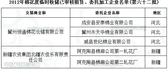 2012年度棉花臨時(shí)收儲(chǔ)已審核租賃、委托加工企業(yè)名單(第六十三批)