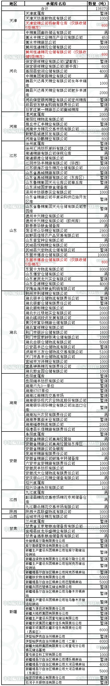 定于12月31日在以下指定倉庫收儲2012年度棉花136370噸。哈密雙銀棉業(yè)有限責(zé)任公司僅限東疆棉花企業(yè)競拍,新疆維吾爾自治區(qū)棉麻公司博樂棉麻站僅限于博樂地區(qū)棉花企業(yè)競拍,以上庫點(diǎn)其他地區(qū)企業(yè)競拍將按違約處理。