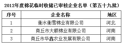 2012年度棉花臨時(shí)收儲(chǔ)已審核企業(yè)名單(第五十九批)