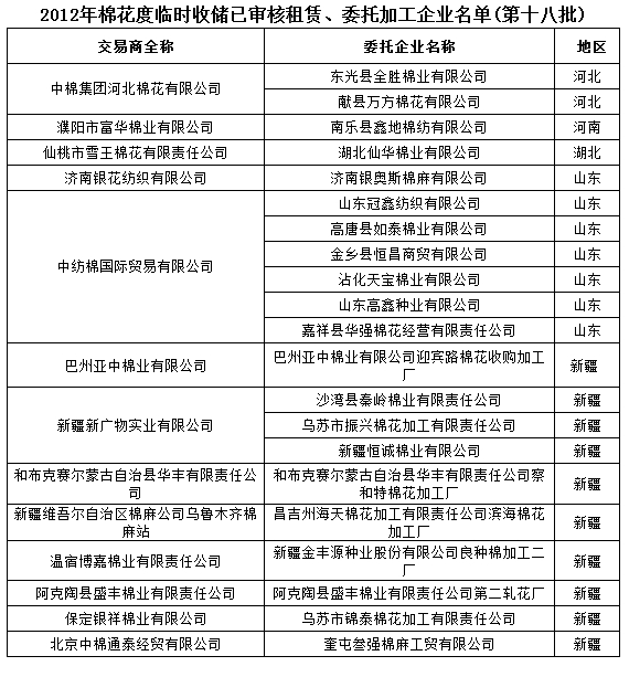 2012年度棉花臨時(shí)收儲(chǔ)已審核租賃、委托加工企業(yè)名單(第十八批)