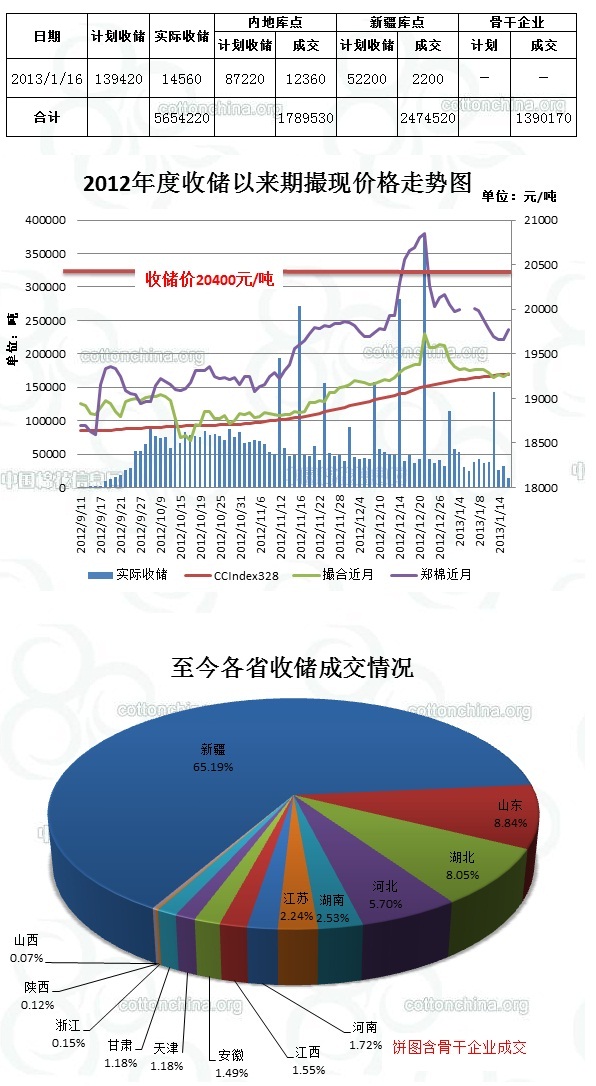 1月16日,計(jì)劃收儲139420噸,實(shí)際成交14560噸,成交比例10.4%,較前一天減少16880噸。其中新疆庫點(diǎn)計(jì)劃收儲52200噸,實(shí)際成交2200噸,成交比例4.2%;內(nèi)地庫計(jì)劃收儲87220噸,實(shí)際成交12360噸,成交比例14.2%。