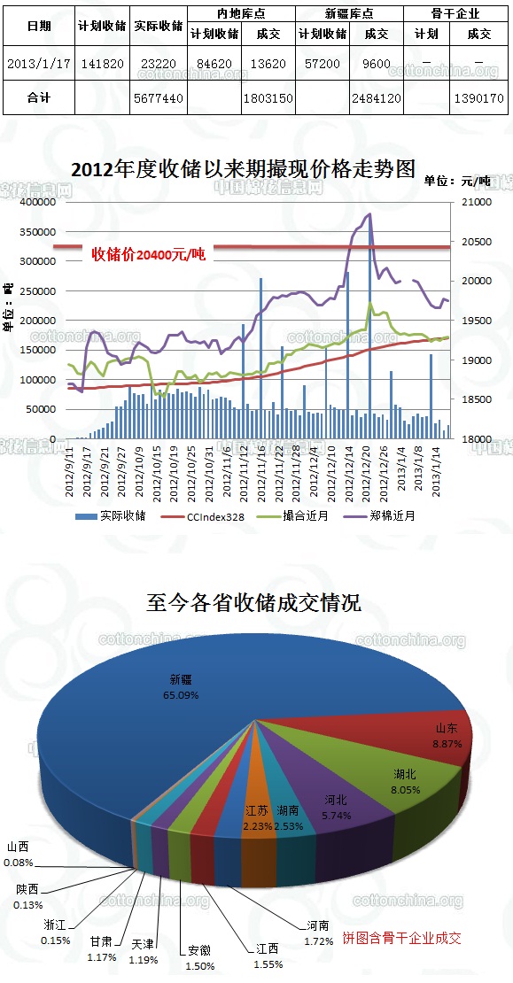 1月17日,計劃收儲141820噸,實際成交23220噸,成交比例16.4%,較前一天增加8660噸。其中新疆庫點計劃收儲57200噸,實際成交9600噸,成交比例16.8%;內(nèi)地庫計劃收儲84620噸,實際成交13620噸,成交比例16.1%。