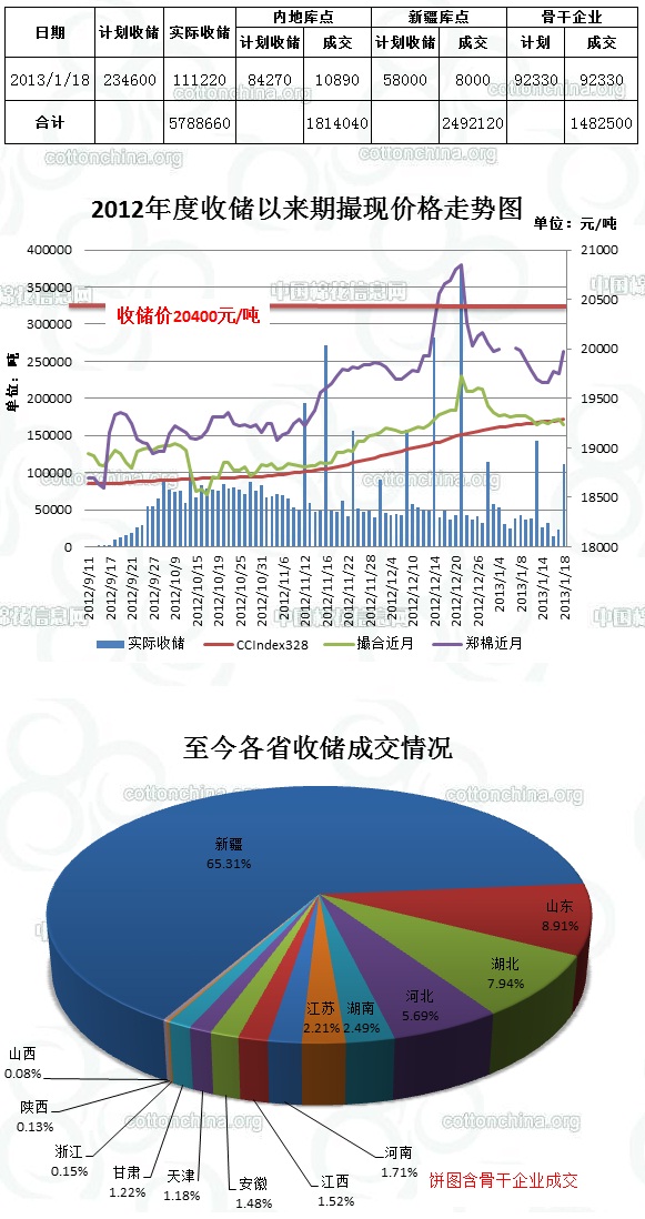 截至今日2012年度棉花臨時收儲累計成交5788660噸,新疆累計成交2492120噸,內(nèi)地累計成交1814040噸,骨干企業(yè)共累計成交1482500噸。