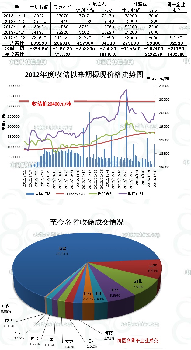 上周(1.14-1.18)共計(jì)劃收儲(chǔ)803290噸,實(shí)際成交206310噸,周成交比例26%;其中內(nèi)地共計(jì)劃收儲(chǔ)437360噸,實(shí)際成交84180噸,較前一周減少70530噸,周成交比例19%;新疆共計(jì)劃收儲(chǔ)273600噸,實(shí)際成交29800噸,較前一周減少107400噸,周成交比例11%。