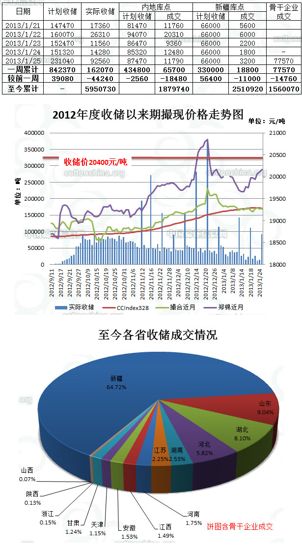 上周(1.21-1.25)共計(jì)劃收儲(chǔ)842370噸,實(shí)際成交162070噸,周成交比例19%;其中內(nèi)地共計(jì)劃收儲(chǔ)434800噸,實(shí)際成交65700噸,較前一周減少18480噸,周成交比例15%;新疆共計(jì)劃收儲(chǔ)330000噸,實(shí)際成交18800噸,較前一周減少11000噸,周成交比例6%。