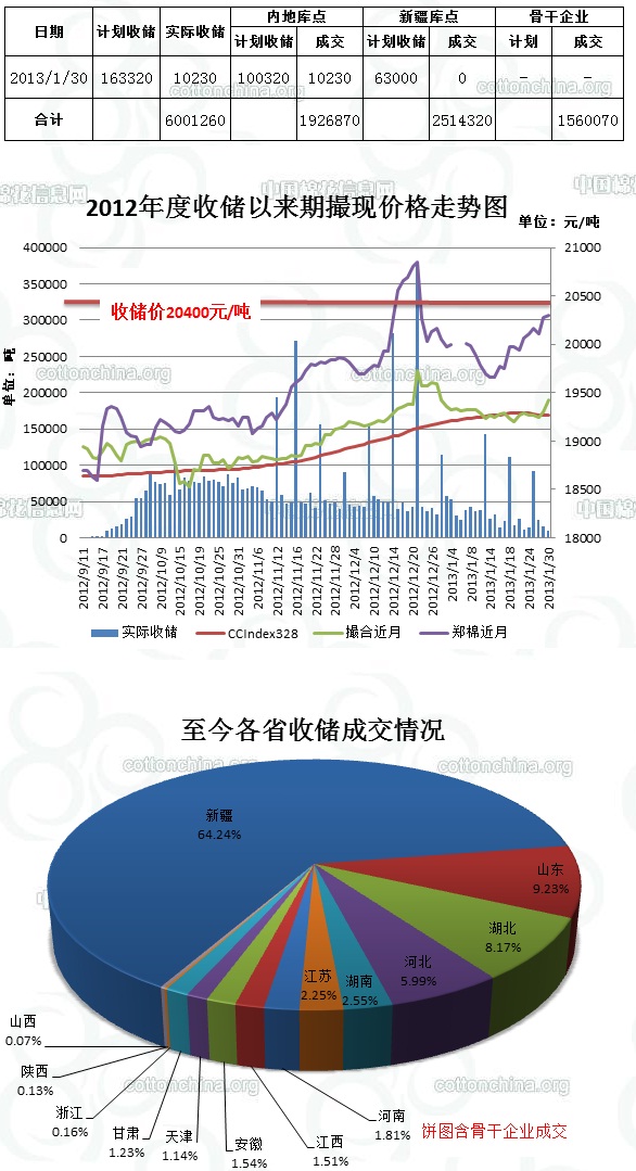 1月30日,計(jì)劃收儲(chǔ)163320噸,實(shí)際成交10230噸,成交比例6.3%,較前一天減少4980噸。其中新疆庫點(diǎn)計(jì)劃收儲(chǔ)63000噸,實(shí)際成交0噸;內(nèi)地庫計(jì)劃收儲(chǔ)100320噸,實(shí)際成交10230噸,成交比例10.2%。