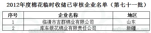 2012年度棉花臨時(shí)收儲(chǔ)已審核企業(yè)名單(第七十一批)