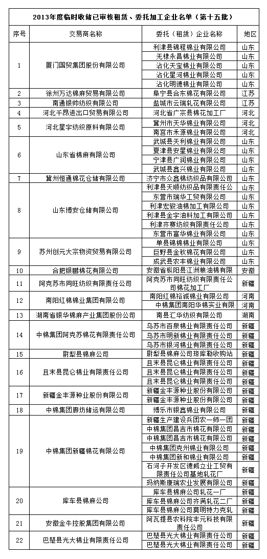 2013年度棉花臨時(shí)收儲(chǔ)已審核租賃、委托加工企業(yè)名單(第十五批)