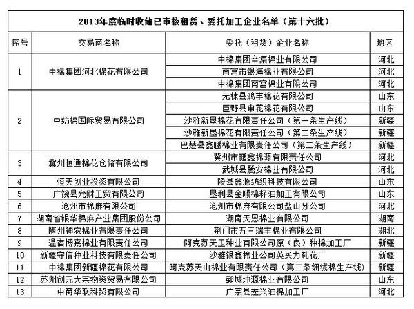2013年度棉花臨時(shí)收儲(chǔ)已審核租賃、委托加工企業(yè)名單(第十六批)