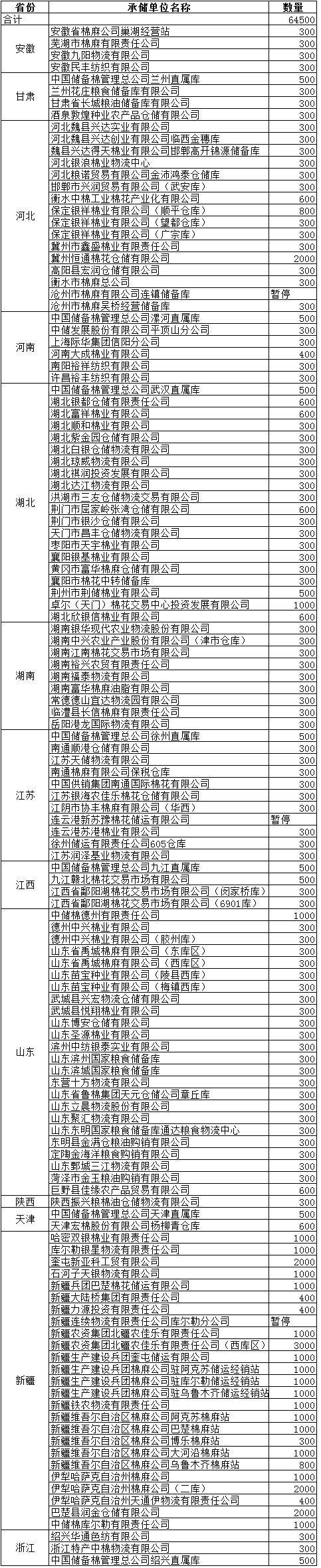 10月23日計劃在以下指定倉庫收儲2013年度棉花64500噸。