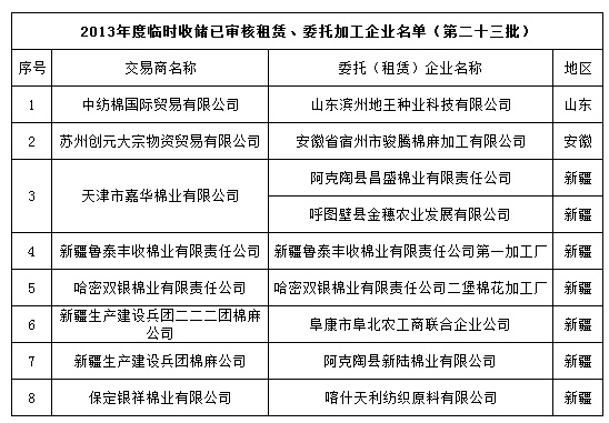 2013年度棉花臨時收儲已審核租賃、委托加工企業(yè)名單(第二十三批)