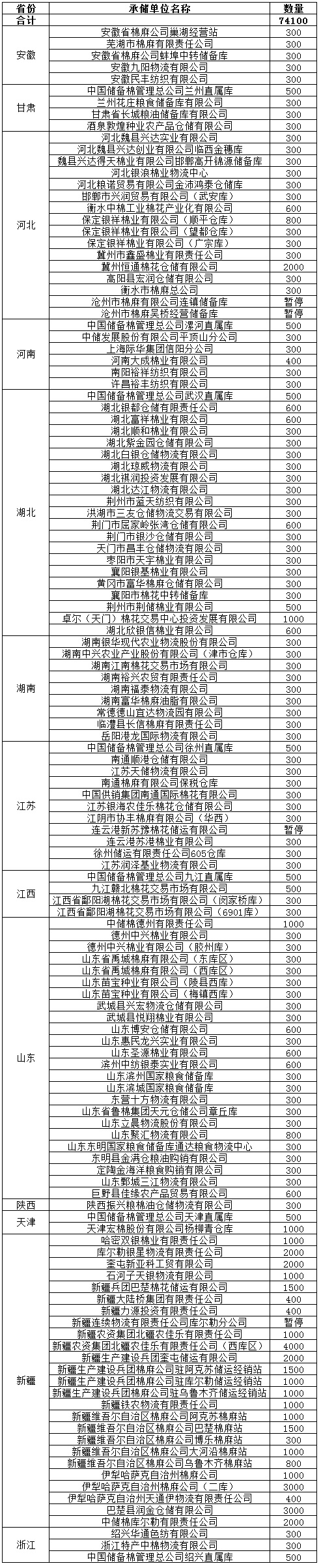 10月24日計劃在以下指定倉庫收儲2013年度棉花74100噸。