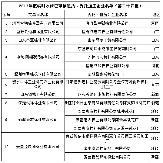 2013年度棉花臨時收儲已審核租賃、委托加工企業(yè)名單(第二十四批)