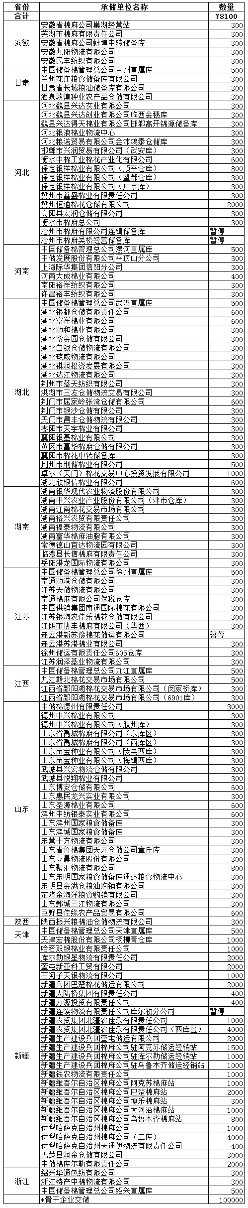 10月25日計(jì)劃在以下指定倉(cāng)庫(kù)收儲(chǔ)2013年度棉花178100噸(含骨干企業(yè)交儲(chǔ)棉花100000噸)。