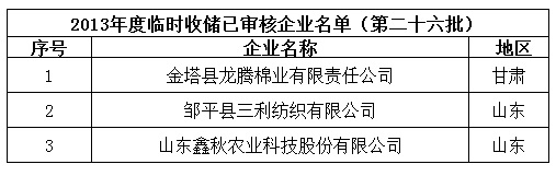 2013年度棉花臨時收儲已審核企業(yè)名單(第二十六批)