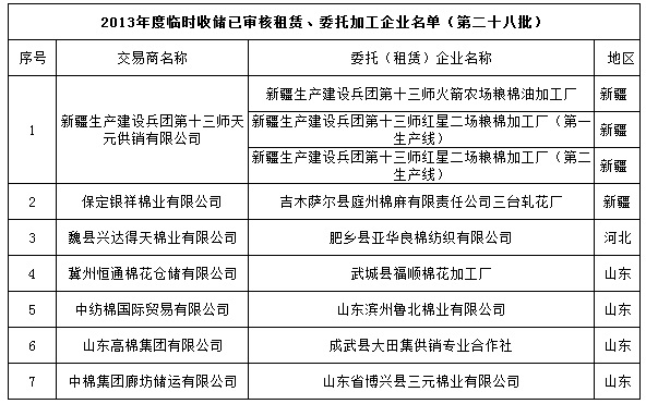 2013年度棉花臨時(shí)收儲(chǔ)已審核租賃、委托加工企業(yè)名單(第二十八批)
