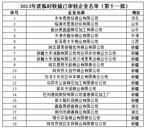 2013年度棉花臨時(shí)收儲(chǔ)已審核企業(yè)名單(第十一批)