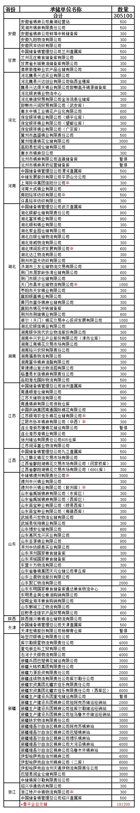 為滿足新疆企業(yè)交儲(chǔ)需要,緩解新疆地區(qū)入庫(kù)壓力,在不影響內(nèi)地就近交儲(chǔ)的前提下,以下帶“※”庫(kù)點(diǎn)作為內(nèi)地接收新疆棉花交儲(chǔ)的指定庫(kù)點(diǎn)。