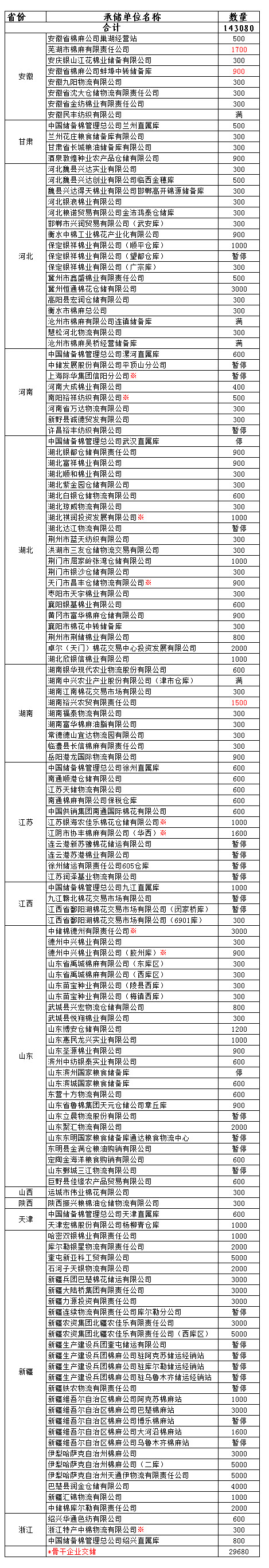 為了滿足新疆企業(yè)交儲需要,緩解新疆地區(qū)入庫壓力,在不影響內(nèi)地就近交儲的前提下,以下帶“※”庫點作為內(nèi)地接收新疆棉花交儲的指定庫點。