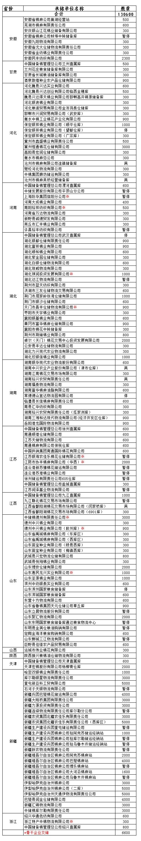 各涉棉企業(yè): 11月27日在以下指定倉庫收儲2013年度棉花130600噸。 為了滿足新疆企業(yè)交儲需要,緩解新疆地區(qū)入庫壓力,在不影響內(nèi)地就近交儲的前提下,以下帶“※”庫點(diǎn)作為內(nèi)地接收新疆棉花交儲的指定庫點(diǎn)。