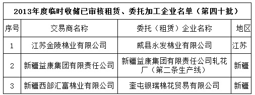 2013年度棉花臨時收儲已審核租賃、委托加工企業(yè)名單(第四十批)