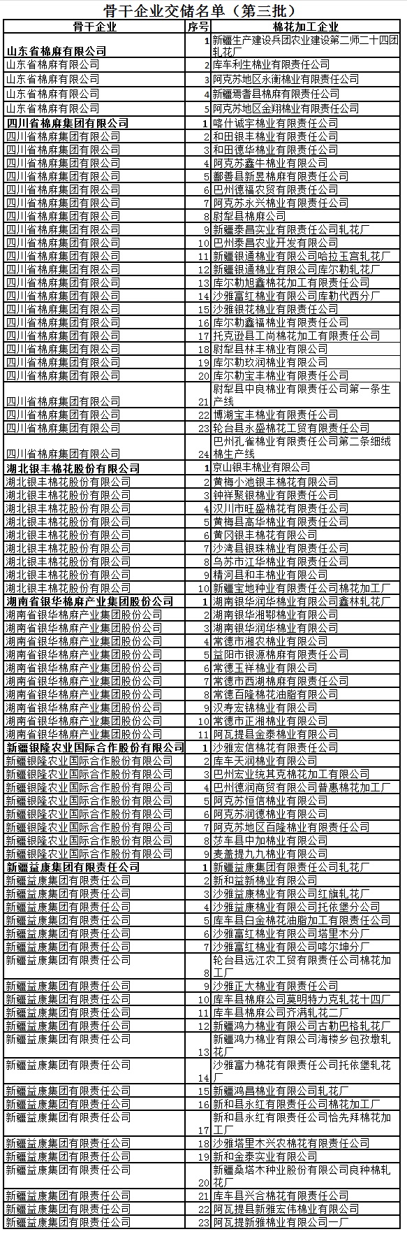 錦橋紡織網(wǎng)—資訊頻道> 棉花信息> 收儲>正文 骨干企業(yè)交儲名單(第三批)